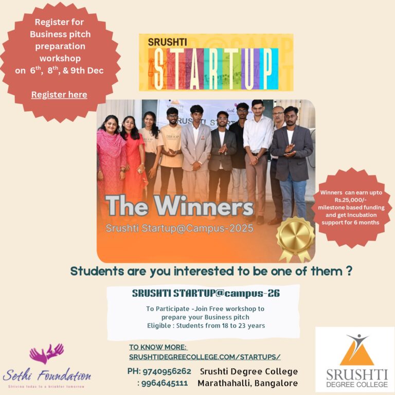 Srushti started two decades ago, built on the foundation of enabling youth as Social Innovators impacting education of rural children. In 2011, Srushti Degree College was established, aiming to contribute to society by providing students from all classes access to Higher Education, where their aspirations, innovative and entrepreneurial spirit with co-creative leadership skills are nurtured. Students get educated holistically within a campus where they flourish, preparing themselves for careers and purposeful living to impact themselves, society, and the environment