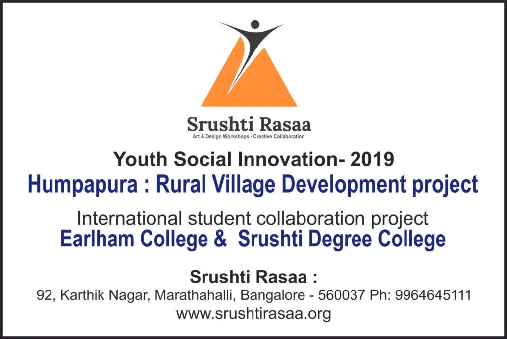 Srushti Rasaa initiated a 4-week Youth Social Innovation project at Humpapura village, Srirangapatna, Mysuru district, on 5th July 2019. This is an international students’ collaborative project, involving 5 students of Srushti Degree College, Bangalore, and 3 students of Earlham College, Richmond, USA, who have worked on this project for the last 4 weeks. Students were enabled with workshops at Srushti Rasaa to build perspectives and co-create solutions with the community. They have developed innovative solutions to address the rural women’s entrepreneurial opportunities and have developed innovative modules to develop the spoken English skills in rural children. This project was funded by Earlham College, the US.